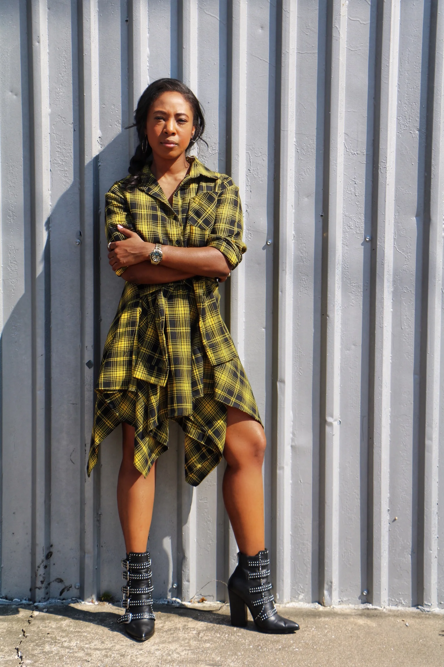 Y'all know that I love dresses because they are easy to wear, but it was something about this plaid dress that I couldn't get over. It isn't a piece that I would normally gravitate to but It had this kind of hard, edgy look that I thought might be a cool switch-up to my personal style. The hemline is asymmetrical and has a piece that wraps around the waist as if you took a shirt or jacket and wrapped it around your waist that is very reminiscent of early 90's fashion (I hate the name but for the purpose of fashion references, think the heroin-chic era in fashion; early Kate Moss, Nirvana era).